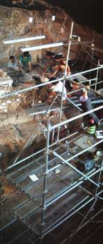Tepeye tırmanmayı başardığınızda, tellerle çevrili bir alanı aşıyorsunuz ve ağaçların altından geçerken göreceğiniz kara kara kayalar: mağaranın girişini belirtiyor. Girişte, devasa büyüklükte, iskeleler kurulu. Çünkü, günümüzde, burada resmi kazı çalışmaları sürdürülüyor.
