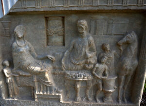 Stel üzerinde iki ana figür vardır. Sol tarafında oturur vaziyette kadın, hemen onun arkasında ise stelin orta bölümünde uzanmış bir erkek figürü yer almaktadır.