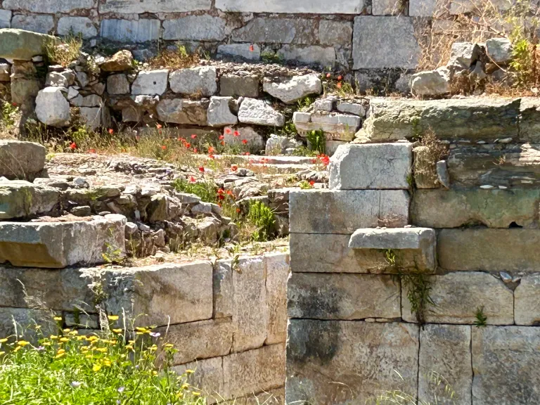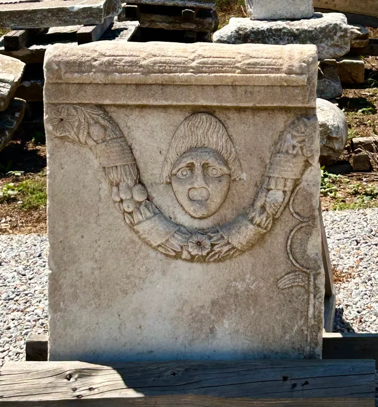 Tiyatrodan çıkarılanların bulunduğu açık alanda inanılmaz güzellikte kabartmalar bulunmaktadır. Tiyatrodan çıkan alınlıkta resmedilmiş olan Demeter, kızı Perseppone ve Hades ile ilgili kabartma özellikle ilgi çeker.
