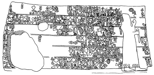 Dokuz satırdan oluşur. Yazıtın sağ kenarında bulunan ve nispeten aşınmış durumda, ayakta duran insan figürü: uzun saçı ve sakallı Asur etkisi göstermektedir. Sol tarafta, açılmış biri büyük, diğeri daha ufak olan iki oyuk, yazıtın bazı satırlarına zarar vermiştir.