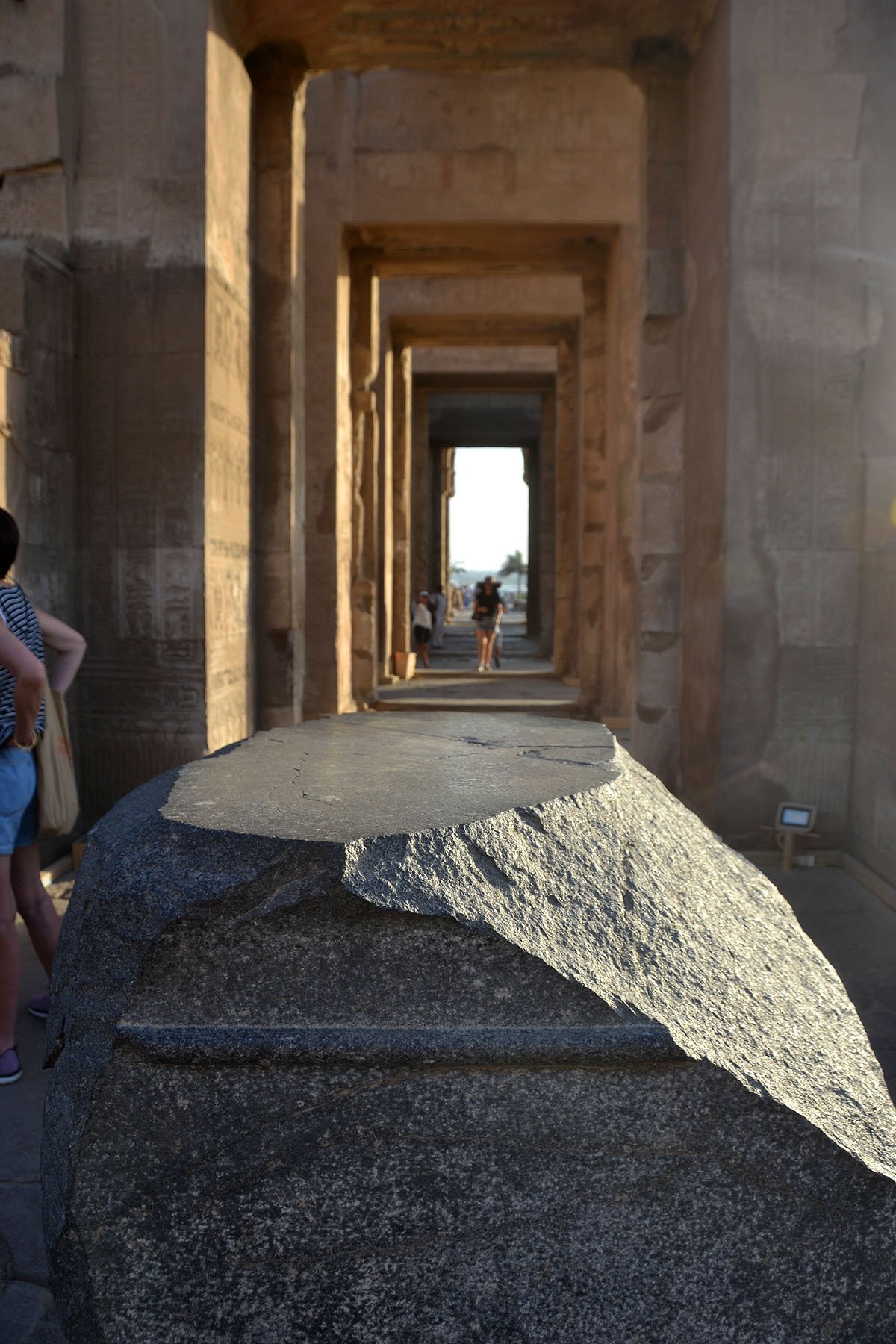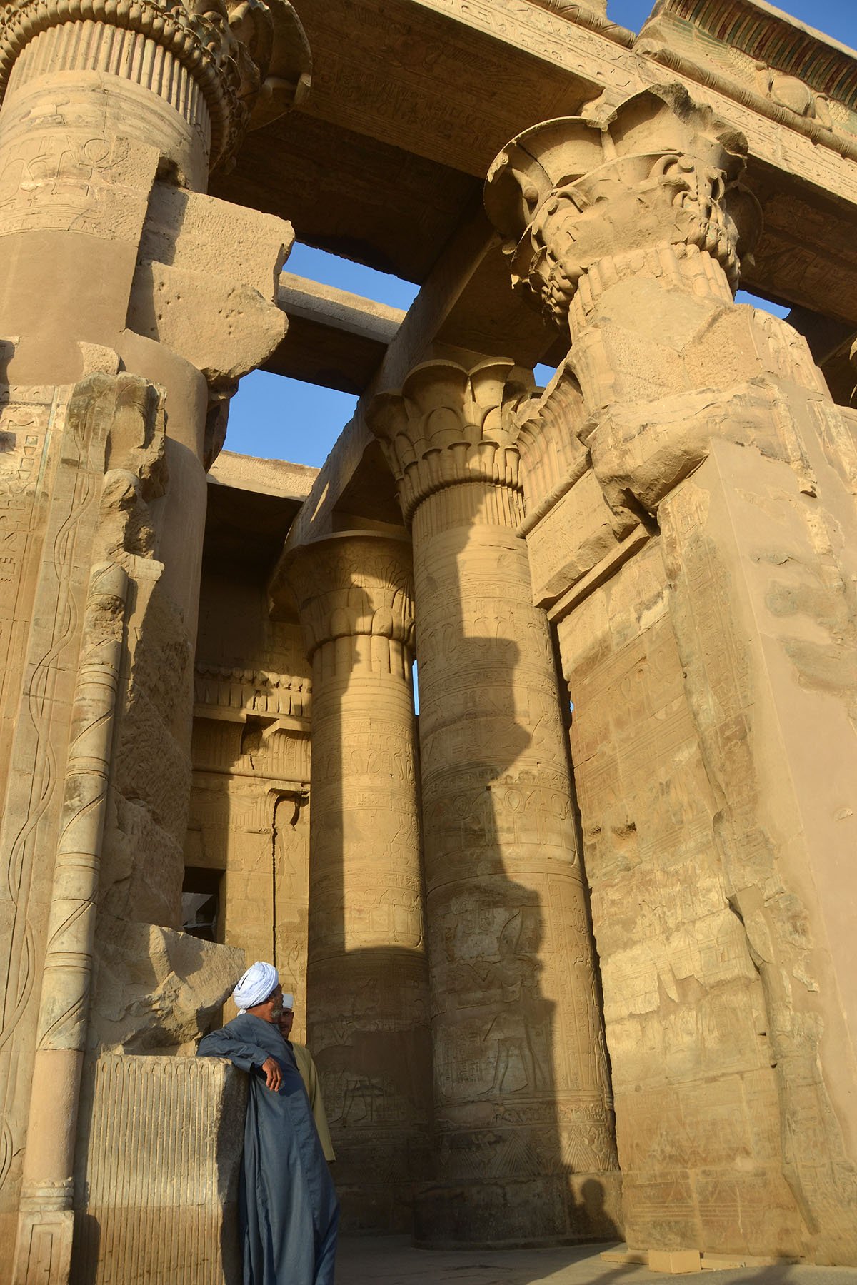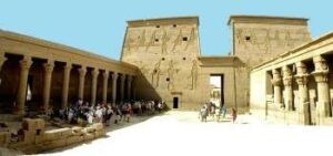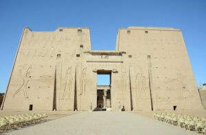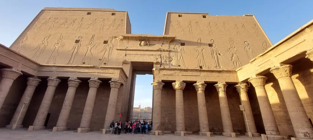 Horus tapınağının girişinde: yaklaşık 36 m yüksekliğinde, 2 büyük kuleye sahip, anıtsal bir kapı vardır.