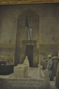Evet: burayı da gezdikten sonra merdivenlerden aşağıya iniyoruz ki, bu sırada merdivenlerin üstünde bulunan Timur’un mezarı tablosu: gerek büyüklüğü ve gerekse güzelliğiyle hemen dikkatinizi çekecektir.