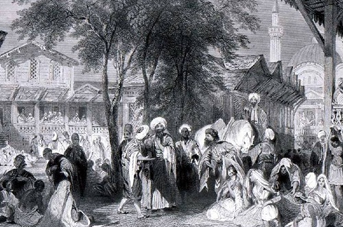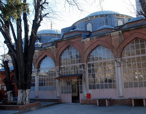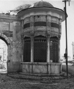 Evliya Çelebi: giriş yönündeki iki ayakta bulunan çeşmelerden: bütün cemaatin su içtiğini belirtmiştir.
