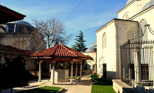 Cami iç avlusunun ortasında, dikdörtgen şekilli ve bitkisel motifli bir şadırvan vardır. Şadırvan havuzunun içinde iki fiskiye bulunur. Söylenenlere göre, şadırvan: o devrin şartlarında kısmen Bizans kanalları kullanılarak Istıranca derelerinden getirilen suyu: kule prensibiyle hava akımı oluşturarak, oksijenle arıtan tarihin ilk içme suyu hazırlama istasyonu imiş.