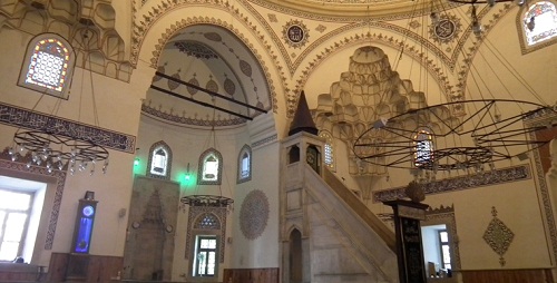 Caminin içinde en göz alıcı yer: mihrap duvarındaki 16 yüzyıl Türk motifleriyle süslü vitraylardır. Bu vitraylar: Sarhoş İbrahim adıyla bilinen, dönemin ünlü cam ustası tarafından yapılmıştır.