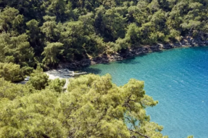 Koyu çevreleyen yamaçlar çam ve zeytin ağaçlarıyla kaplıdır. Deniz kenarında yürürken hem Ege nin mavi sularını hem de bölgenin karakteristik yeşil doğasını bir arada görebilirsiniz.