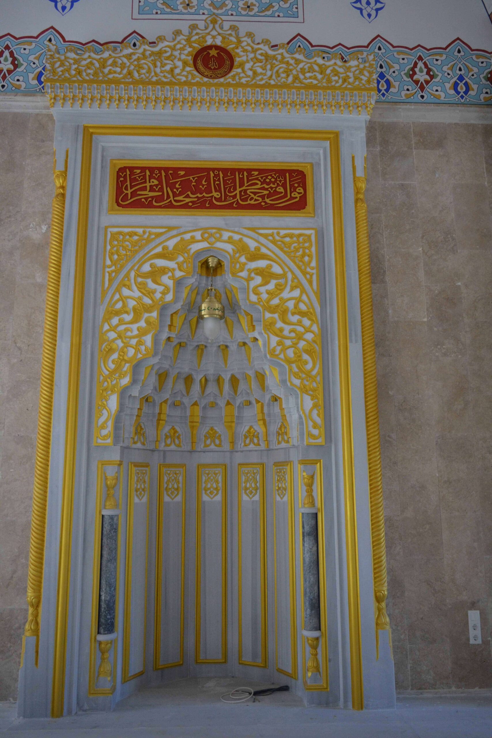 Kıble duvarının ortasında yer alan mihrap, yöresel bir malzeme olan gök mermerden yapılmıştır. Süsleme kompozisyonunda ampir üslup özelliği gösteren altın yaldız renginde boya kullanılmıştır.