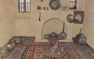 Sağda, duvar boyunca büyük bakır kazanlar, demir saç ayakları üzerine dizilmiştir.