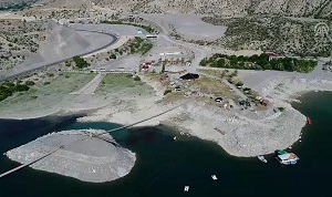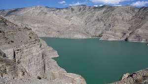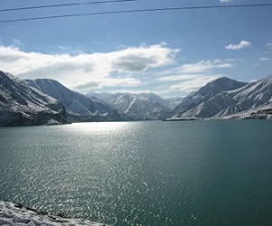 Gölün batısındaki girintili çıkıntılı kıyıya dik inen yalçın kayalıkların arasından geçen dar ve virajlı yol, göle uçurumların tepesinden bakar.