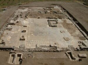 Burada yapılan arkeolojik kazılarda: Roma ve ortaçağ dönemlerine ait sikkeler, iki yazıt ve sütun kaideleri bulunmuştur. Ancak burada bulunan en önemli kalıntı: büyük bir ( yaklaşık 800 metrekarelik) taban mozaiğidir.