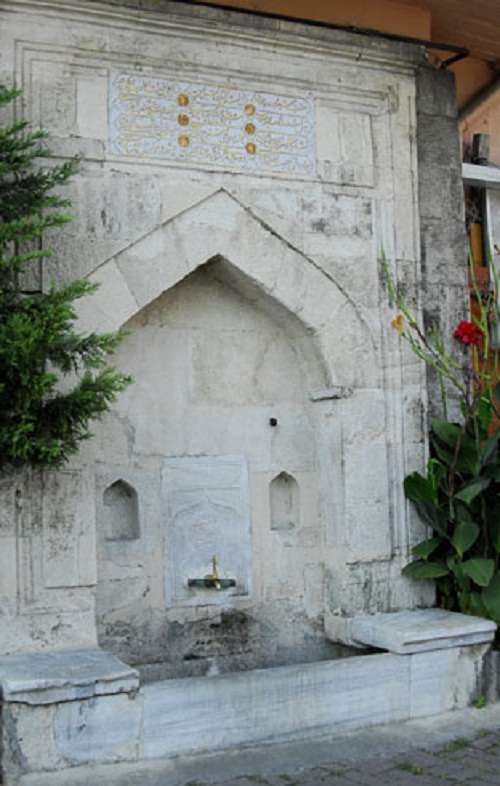 Çeşme: küfeki taşı ile yapılmış, mermer ayna taşlıdır. Mermer yalağı ve Selçuk yıldızı ile servi motifleri işli mermer ayna taşı ilgi çeker. Çeşmenin yanında, harimin altına denk gelen bölümde dükkanlar bulunur.