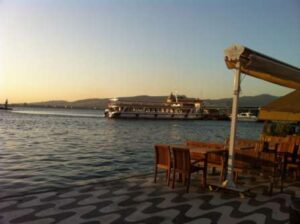 Kıyı boyunca ilerlediğinizde, önce “Pasaport İskelesi” göreceksiniz. Burada: gümrükleme işlemleri yapılıyor ve bir yandan da bölgenin Emniyet Amirliği var. Devam ettiğinizde, bu kez: denizin hemen kıyısında, yani denize sıfır konumdaki kafeteryalar, birahaneler göreceksiniz. Özellikle: biraları servis ettikleri ilginç bir düzen var, 3-4 bardaklık birayı tek bir uzun bardak benzeri bir şekilde servis yapıyorlar. Öte yandan, nargile keyfi çıkaranlar var. Tavla oynamak da mümkün.