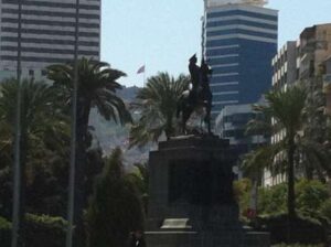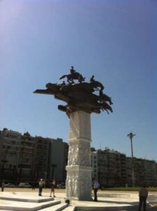 Pasaport iskelesinin hemen karşı çaprazında yine İzmir şehrinin simgesi, Büyük önder Atatürk’ün, parmağını ileriye uzatarak “İLK HEDEFİNİZ AKDENİZDİR, İLERİ” şeklinde emir verdiği atlı heykeli bulunan, Efes Otelinin hemen önündeki meydan karşımıza çıkıyor.