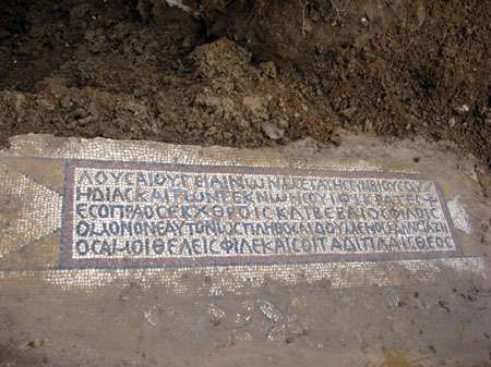 Burada: bir yazıt var. Yazıt: mozaik üzerinde, 3 x 6 metre ebatlarında ve 5 satırdır. Bitkisel ve geometrik motiflerle süslüdür. Yazıtta bulunan yazının anlamı: “Eşin Hedia ve çocuklarınla, burada sağlıklı banyo yap.