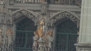 Zahringen çeşmesi: tam zırhlı, ayı heykeliyle bulunan kişi, Bern şehrinin kurucusu Berchtold von Zahringer’dir ve elinde altın aslan tutar.