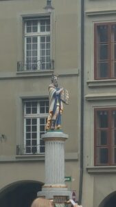 Tipik ve rengarenk üniforması içinde: Bernli bir bayraktar heykelidir. Çeşme: 1542 yılında yapılmıştır.