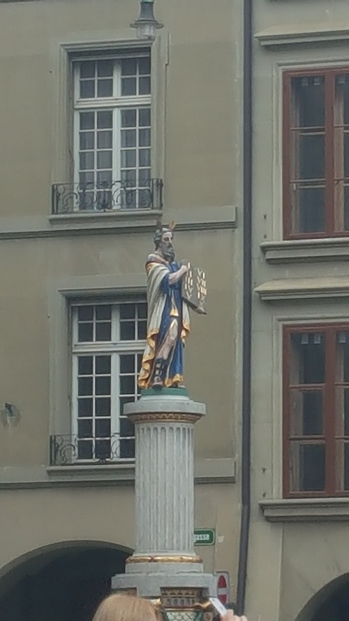 Bu heykeldeki kişinin elinde iki yazılı taş kitabe bulunmaktadır. Bunlar: Musa tarafından indirilen Yahudiliğin On emridir. Bu heykelin: hemen katedralin çıkış kapısı önüne dikilmesinin sebebi: katedralden çıkan Katoliklere “On emri” hatırlatmaktır. (Bernliler Protestandır.) Heykeldeki adam figürünün kulaklarının neden öyle işaretlendiği bilinmiyor.