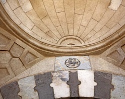 Giriş kapısı üzerindeki kitabeden başka mukarnas altındaki iki bölümde, mimarın adı iki ayrı kartuş içinde tekrar yazılmıştır.