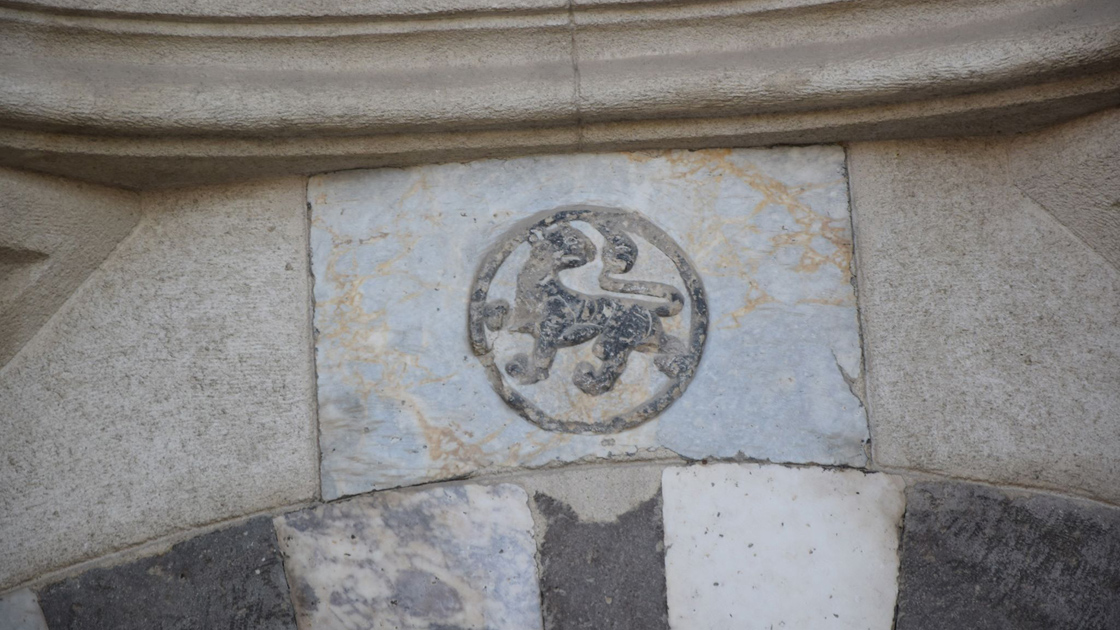 Kapı kemerlerinin üzerinde, sarkıtların altında ise bir para arması ve iki tarafında yazı vardır.