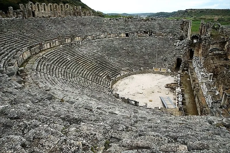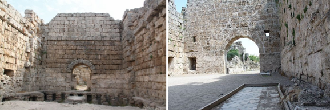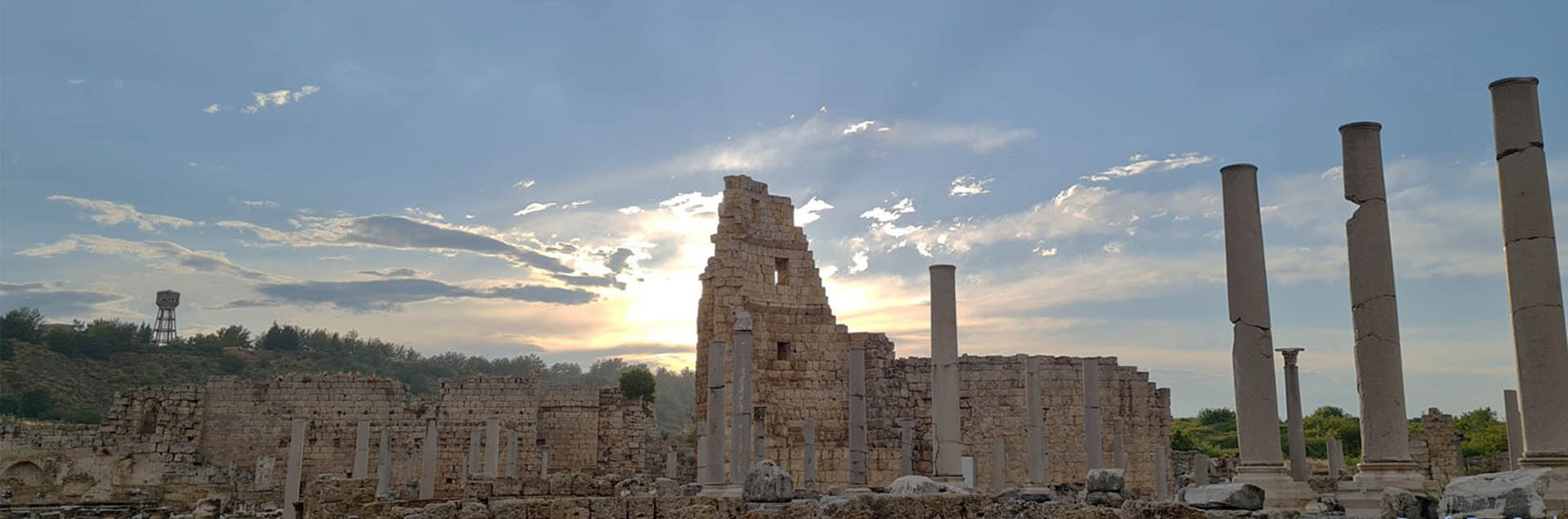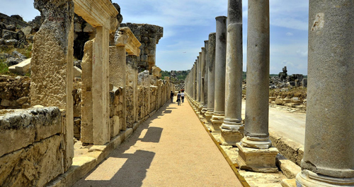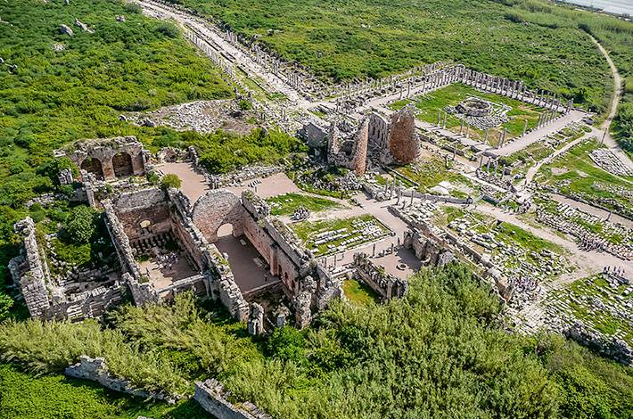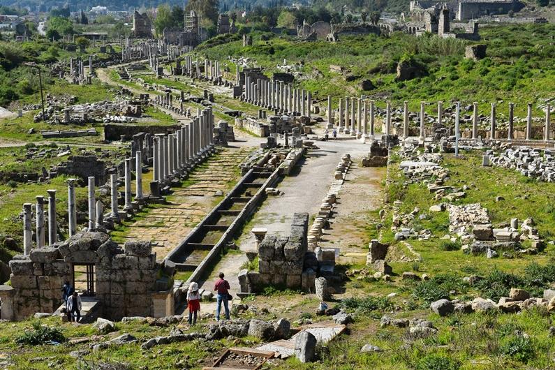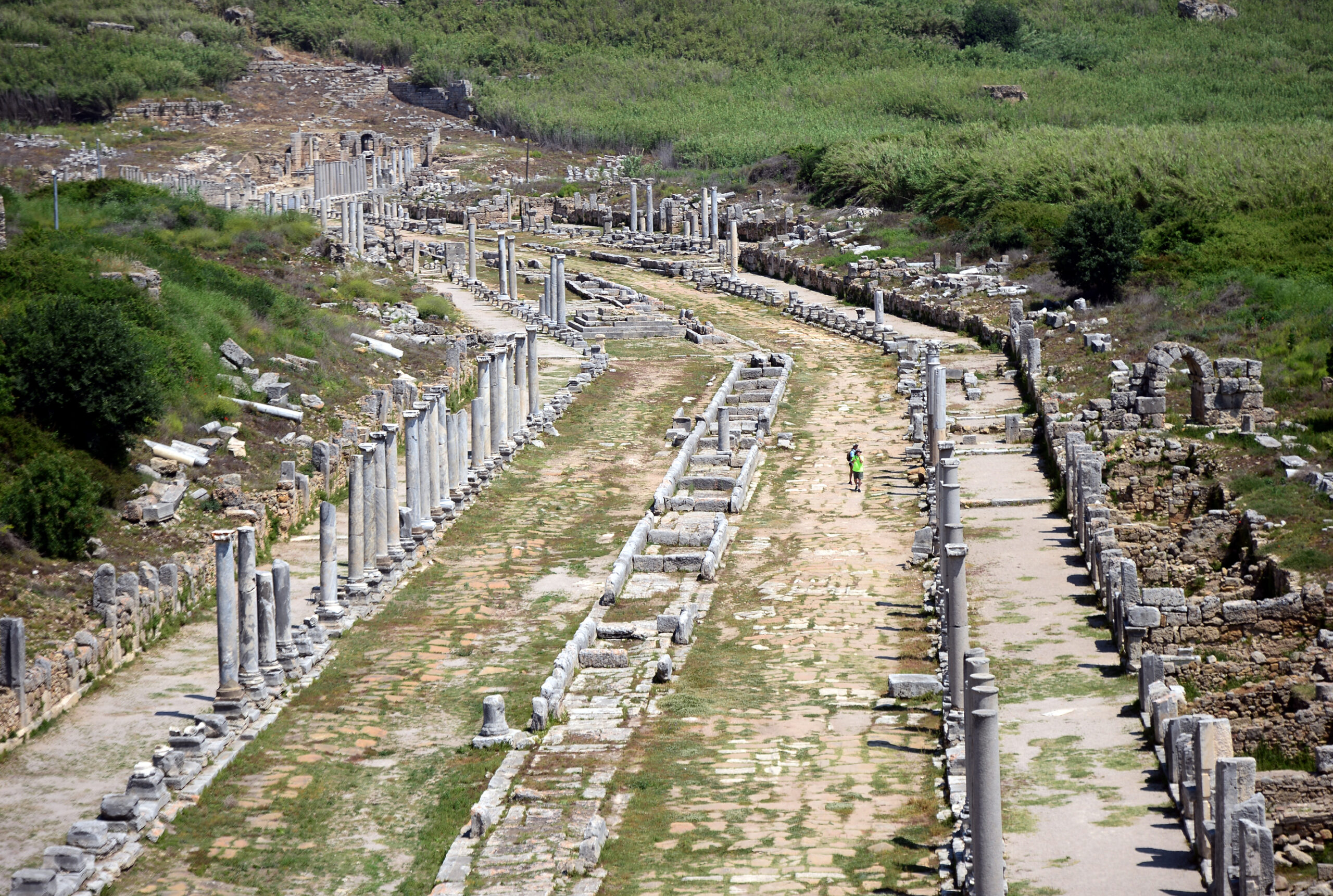 Evet, aslında Perge antik kentini, dörde ayıran iki sütunlu cadde vardı. Yani yukarıda sözünü ettiğim cadde gibi bir sütunlu cadde daha var. Bu yapılar Roma döneminde kentin ihtişamını gözler önüne serer.