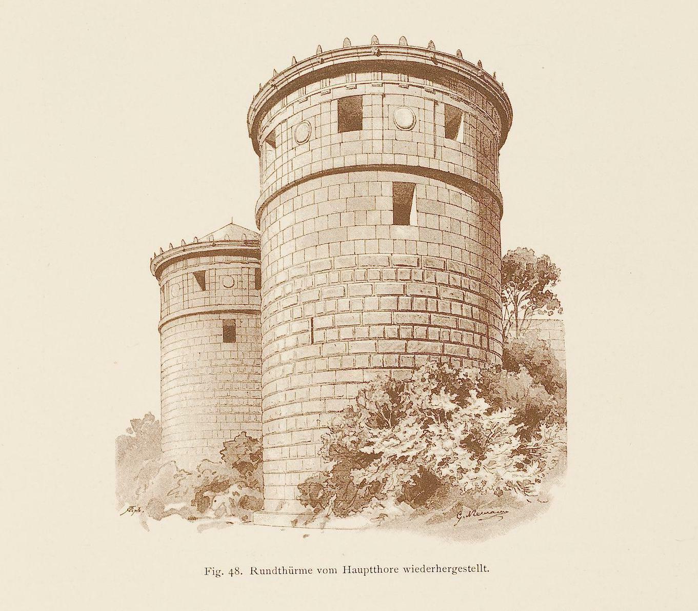 Bir zamanlar aralarında kente girişi sağlayan ana kapı bulunurdu.