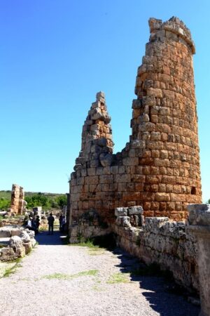Antik kente girildiğinde ilk dikkat çeken, büyük bölümü yıkılmış olsa da görkemiyle hala hayran bırakan ve Perge’nin sembolleri olarak kabul edilen iki kule, MÖ 3’ncü yüzyıla tarihlenir.