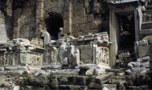 Avlu duvarlarının nişlerinde M. Plancius Varus ile oğlu Plancius Varus, Plancia Magna gibi kente hizmet eden önemli kişilere ait heykellerin bulunduğu sanılmaktadır. Yazıtlı kaideler üzerinde duran heykellerin çoğu Prof. Mansel tarafından, 1943-1956 yıllarında yapılan kazılar sırasında ortaya çıkarılmış ve Antalya Müzesinde korunmaktadır. (Neyse ki çalınıp kaçırılmamış)