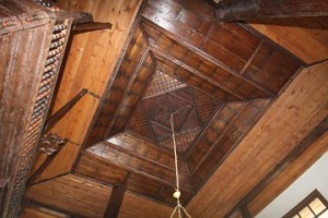Tavan ahşap malzemeden yapılmış olup göbek bölümünde ahşap işlemeler vardır. Caminin beden duvarları tümüyle ahşap iken, 2006 yılında Vakıflar tarafından yapılan restorasyon sonrasında bazı bölümleri kesme taştan yapılmıştır. Caminin ikinci katı, 6 sütun üzerine yükseliyor. Bu sütunların başlıklarının ahşap işçiliği görülmeye değerdir.